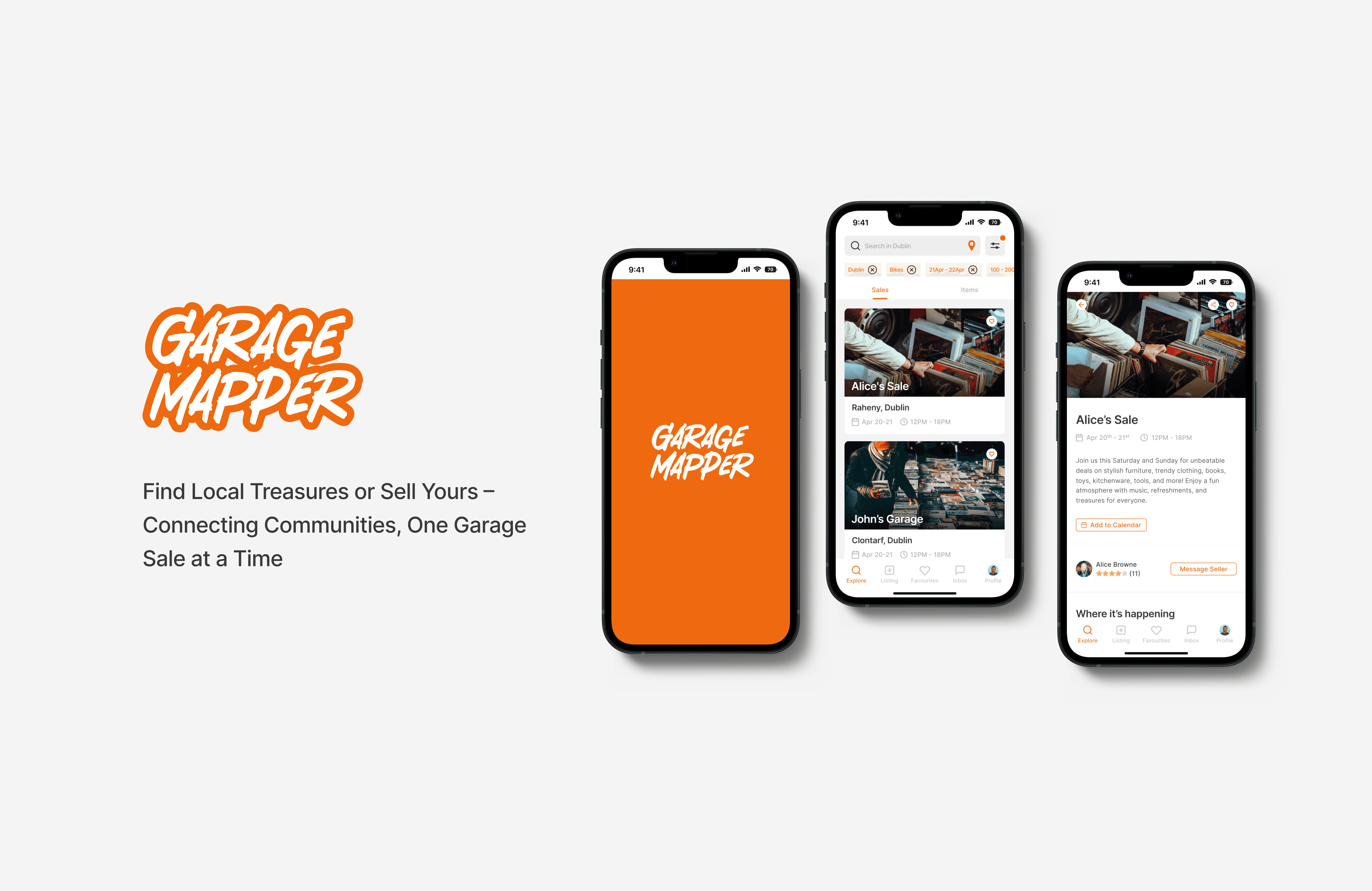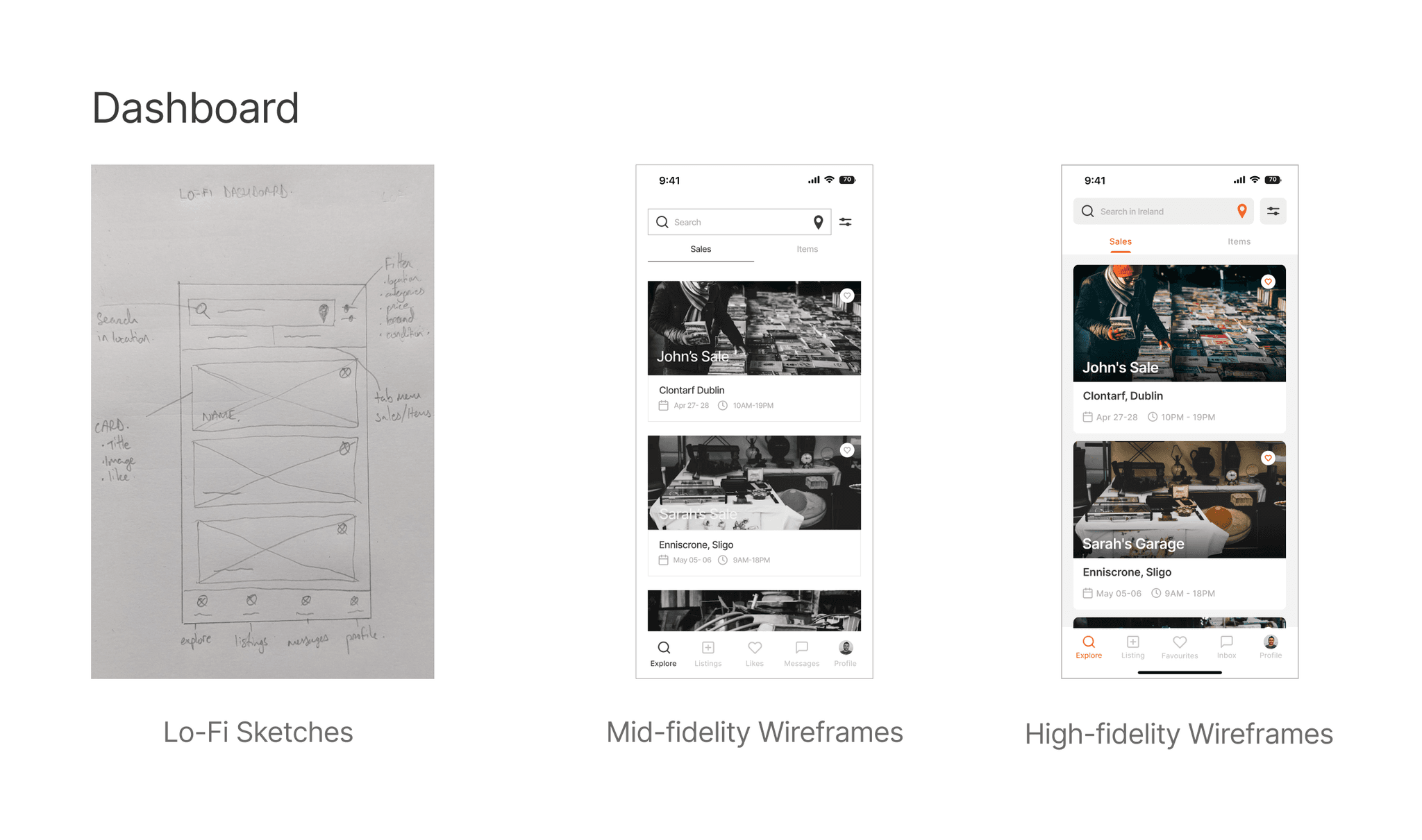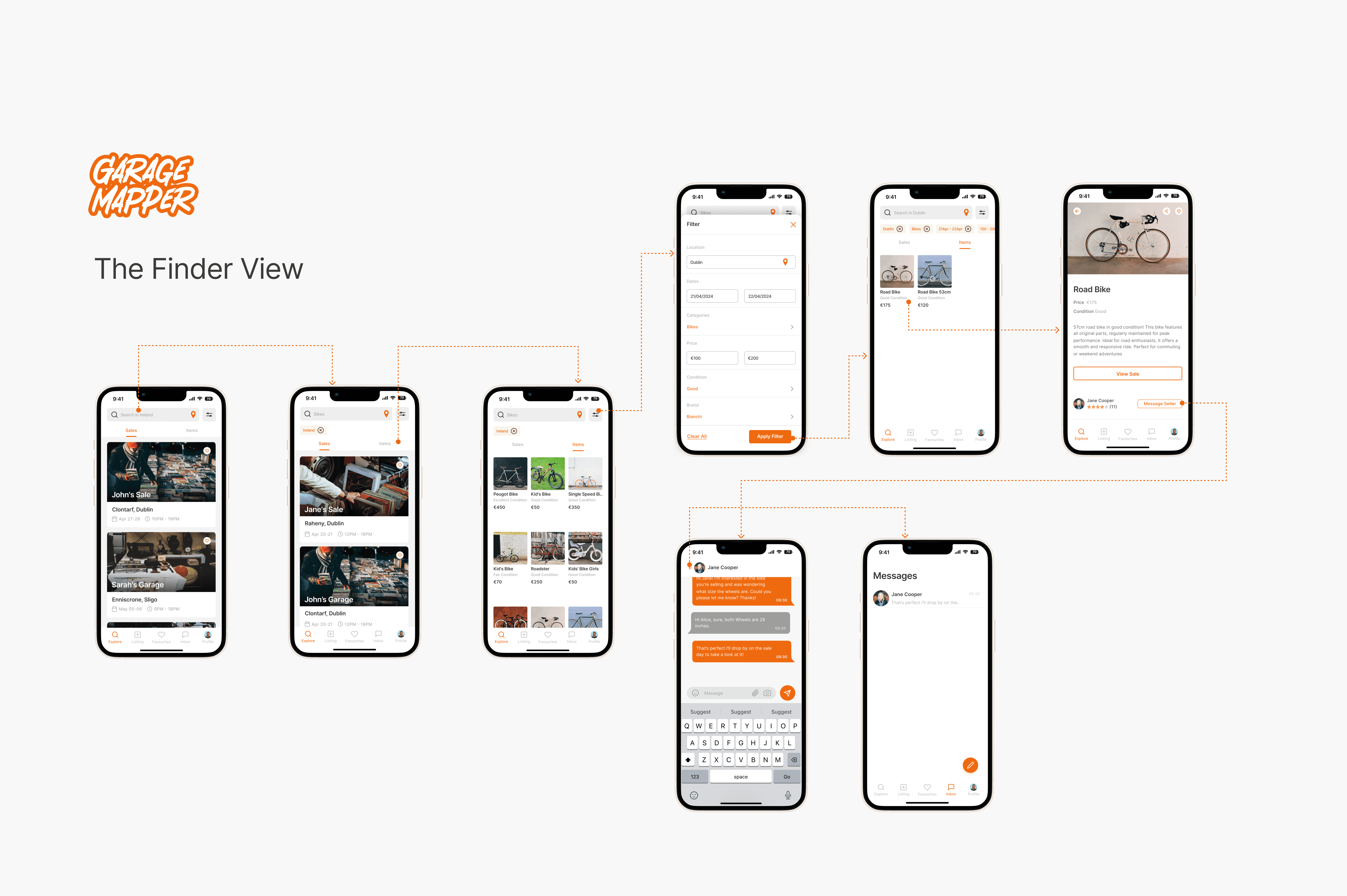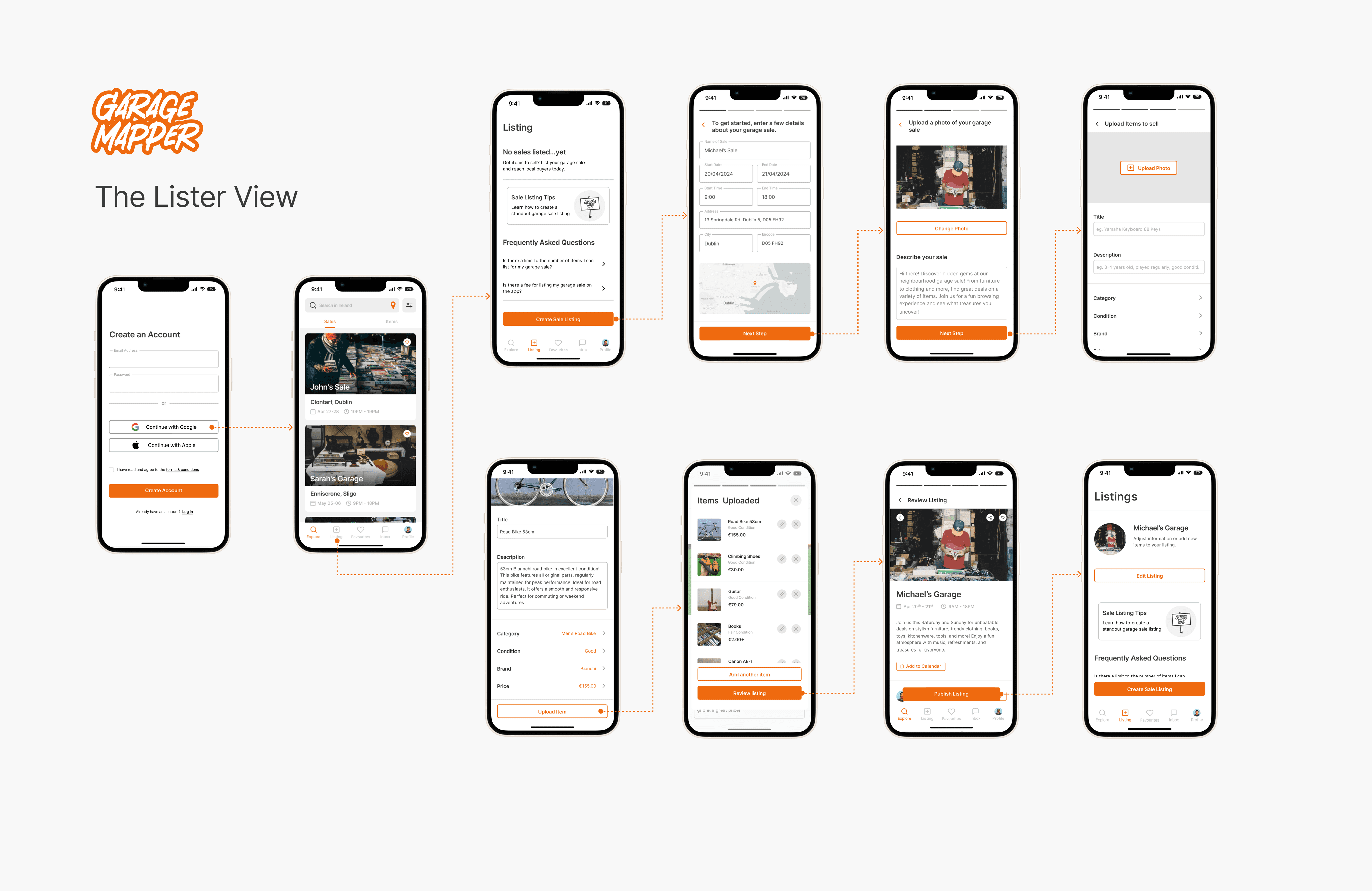 After finalising the High-fidelity mockups, a Prototype was made to walk through the flows of sign up, create a profile, create a new garage sale listing for 'the Lister' and Search for item/sale, message seller directly for 'the Finder'.
